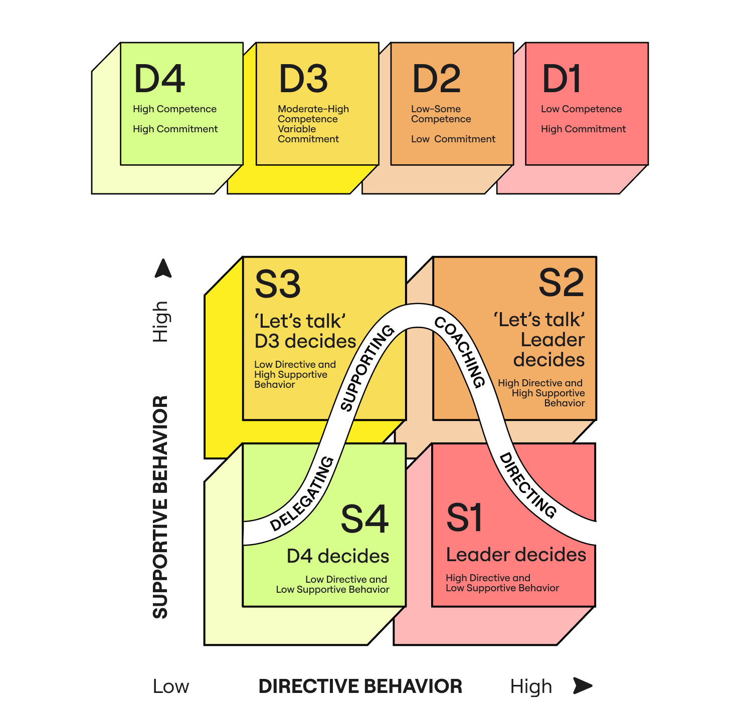 • S4 Delegating: The delegating style is for someone who is committed, and already has the ability to complete the task. Here, I’m really hands off. I’ll say, “Take this task and run with it, and I’ll check on you when it’s done.”